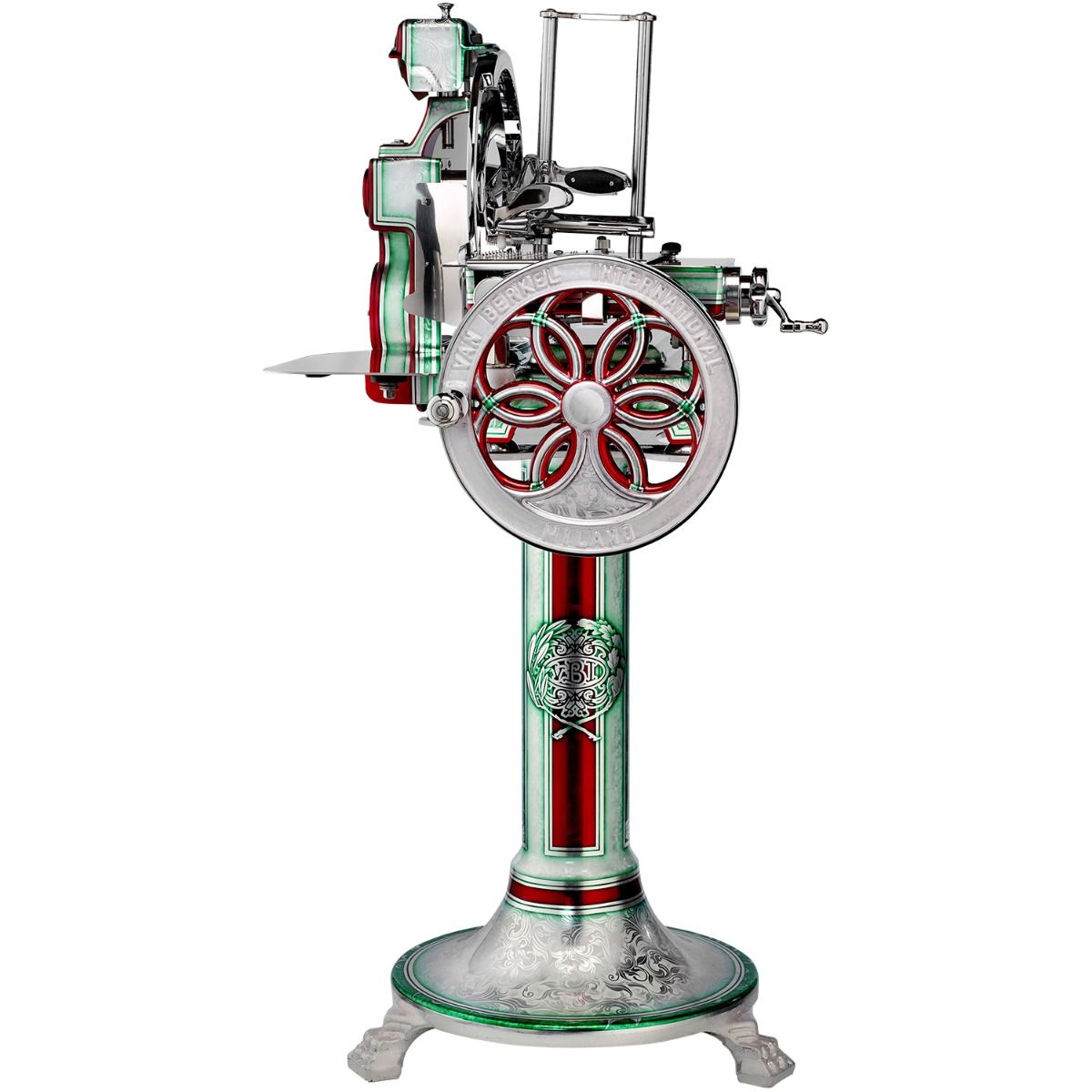 Die lebhaften Kontraste der Aufschnittmaschine interpretieren die italienische Flagge neu: sanft marmoriertes Grün, leuchtendes Rubinrot und eine schillernde weiße Perlmuttfriese.