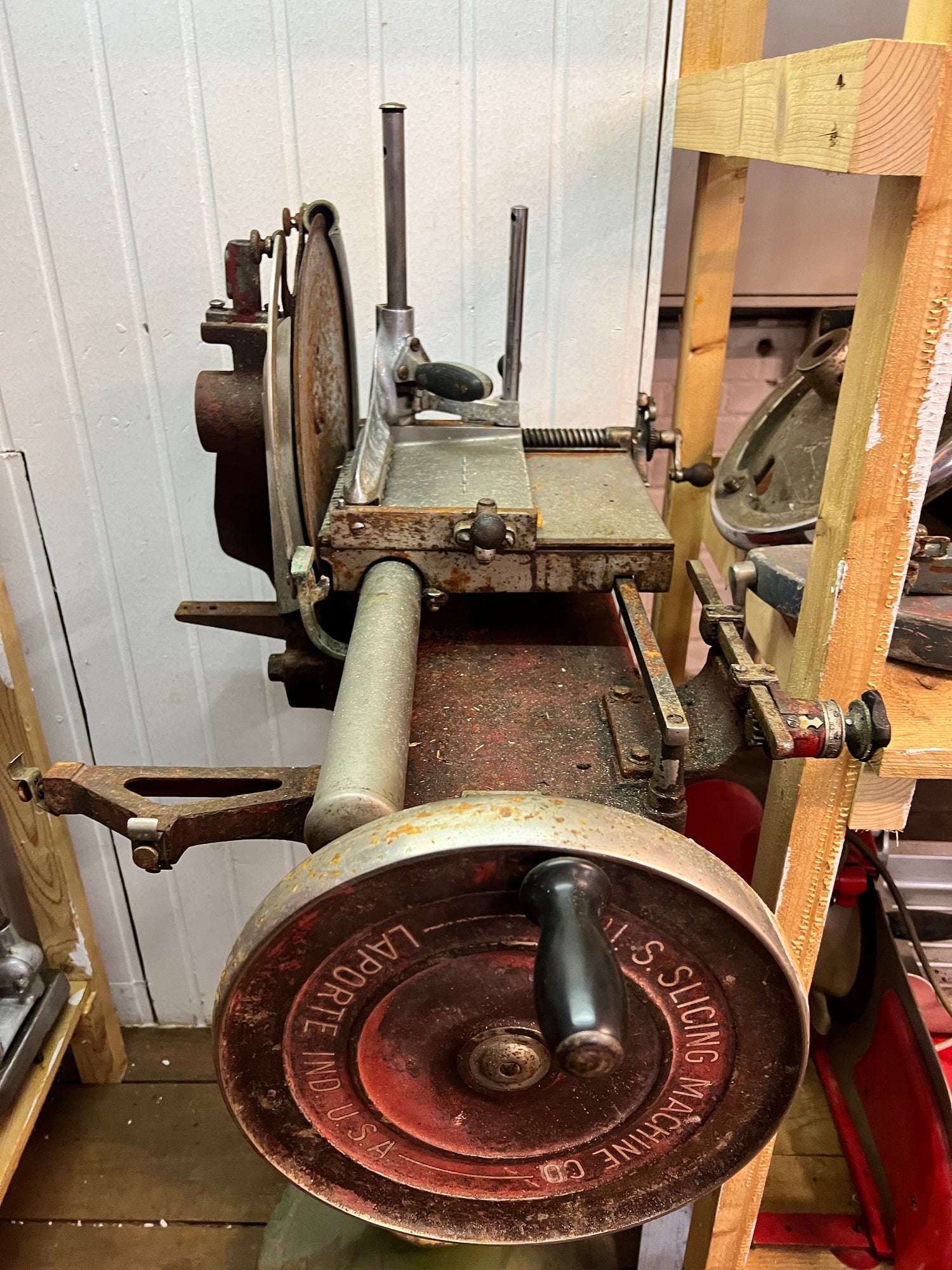 Diese originale Kultobjekt ist die zweitkleinste Aufschnittmaschine, die von von U.S. Slicing Machine je hergestellt wurde.