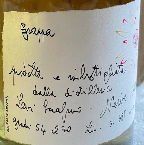 Der Mythos in Flaschengestalt ein Unikat aus der Destillerie Romano Levi im Piemont in Italien. Die Aufschrift „Grappa prodotta e imbottigliata dalla distilleria Levi Serafino Neive-Alba gradi … cl.70 Lic.utf TO“ prägt diese Levi Etiketten. Sie wurden mit einer oder mehreren floralen Zeichnungen von Roman Levi versehen.